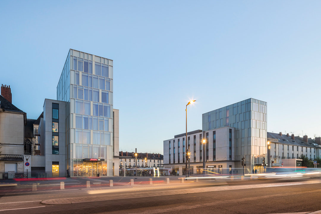 Arte Charpentier Architectes’ Porte de Loire project consists of two hotels, shops and housing. This mixed programme is organised into two symmetrical units on either side of the street. Two 7-storey towers for the Hilton Group hotels mark the entrance on rue Nationale and both rest on a platform intended for shops. Their height does not exceed that of the bell tower of the Saint-Julien church (an adjacent monument) in order to fit into the existing composition. They have glass facades on the Loire side, to reflect the river and the sky, and metal and stone facades on the city side, to accentuate the end of the urban composition and the arrival at the river. The colour choices of the facades on the city side make the link with the rest of the new Porte de Loire square and the heart of the city.