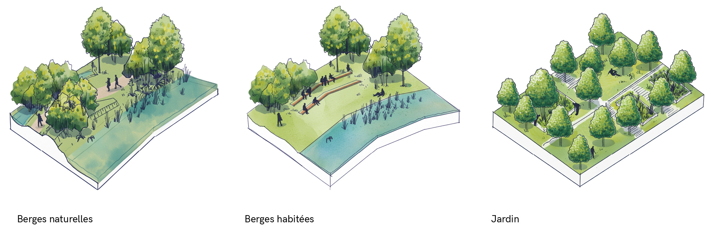 Jardins sensoriels en terrasses et parcours végétal en toiture accueillent biodiversité et usagers, favorisant bien-être et reconnexion à la nature. Ces espaces, refuges écologiques, améliorent confort et gestion des eaux pluviales tout en intégrant pleinement la nature au cœur de la ville. Le projet dépasse les exigences du PLUB de Paris, affirmant une approche exemplaire de renaturation en milieu dense.