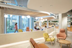 Les plateaux de travail flexibles, baignés de lumière naturelle, s’accompagnent de patios, terrasses et toitures végétalisées, intégrant la nature à tous les niveaux.