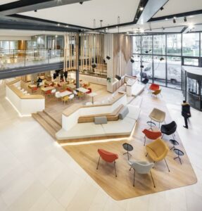 Les façades sont repensées pour plus de transparence et de dialogue avec Paris et Issy-les-Moulineaux, tandis qu’une rue intérieure Est–Ouest rétablit une continuité urbaine. Au cœur du bâtiment, un atrium de 8 niveaux devient un espace de circulation, de rencontre et d’échange.