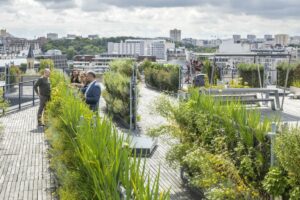 Le rez-de-jardin devient le cœur du site, rassemblant espaces collaboratifs, restauration et lieux de rencontre. Les toitures végétalisées prolongent cette démarche en offrant biodiversité, fraîcheur et nouveaux usages.