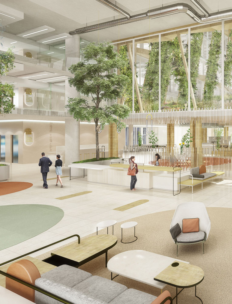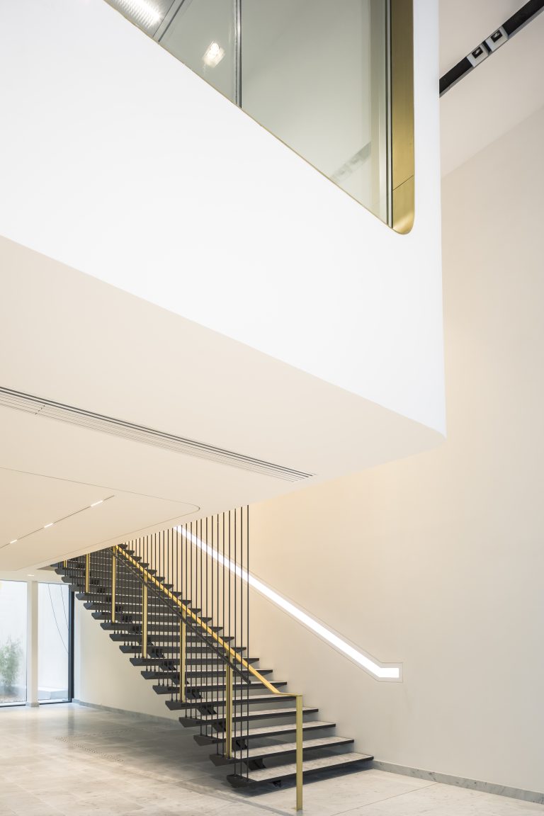 Phase 2 : densification des bureaux et ajout de services (business center, espaces wellness et fitness, locaux vélos). Les espaces modulables prolongent l’écriture contemporaine des halls et offrent confort et flexibilité, avec des escaliers traités comme éléments architecturaux.