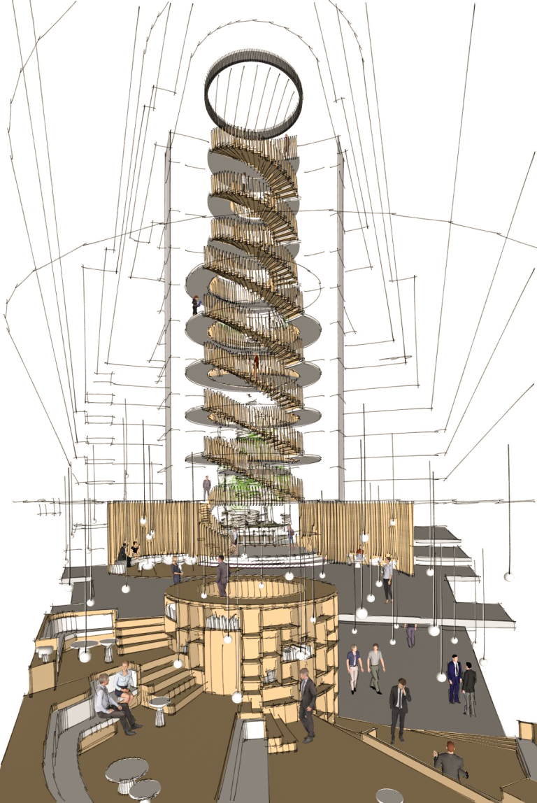 La faille monumentale de la façade principale dévoile un patio elliptique paysager, cœur du projet et terrasse du restaurant d’entreprise. Revêtu de bois exotique et planté de pins et de vivaces, il crée un espace convivial et lumineux. Composé de deux bâtiments de neuf étages de bureaux, l’ensemble comprend un sous-sol avec restaurant, salles de réunion et réserves, ainsi que trois niveaux de stationnement. Deux halls principaux, au nord et au sud, marquent les accès et mènent à un atrium ovale, traversé par une passerelle.