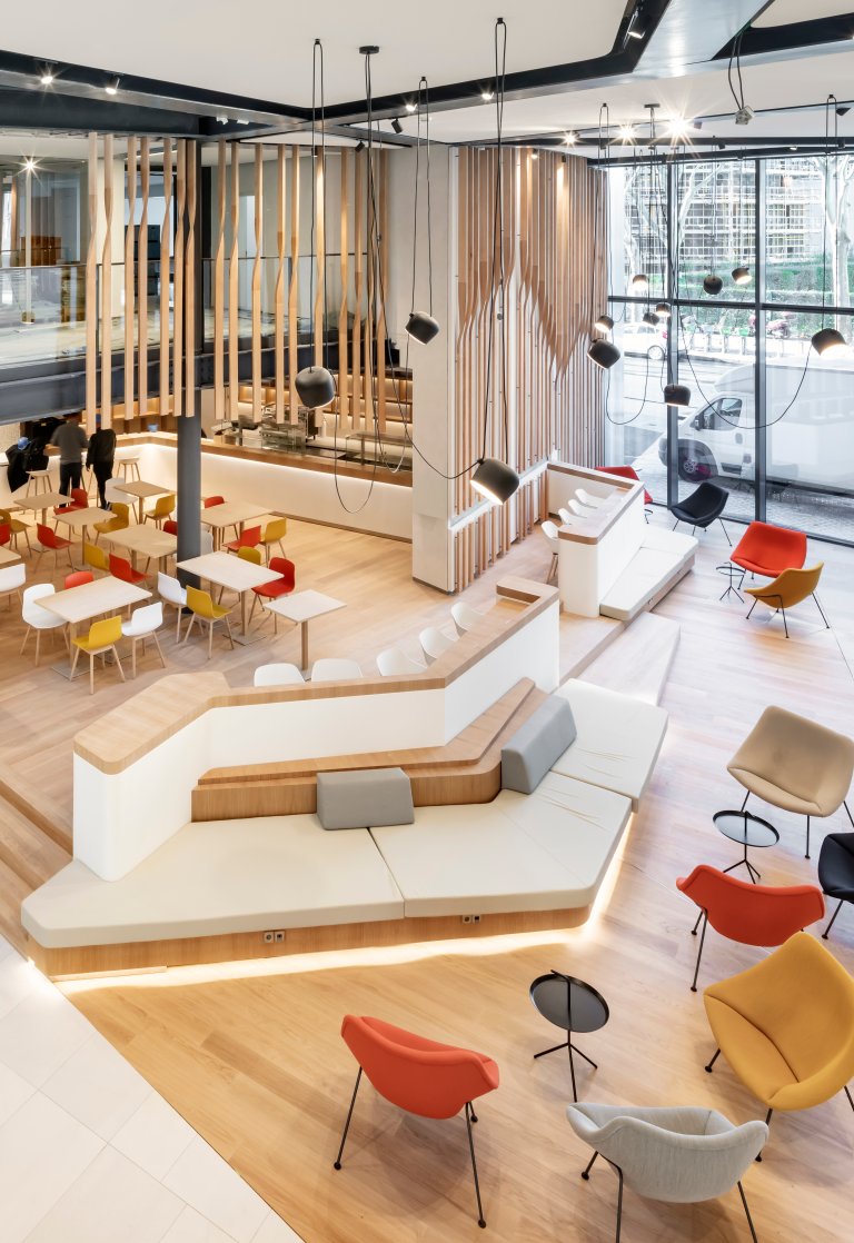 Phase 1 : rénovation et extension des halls A Vincennes et B Plaisance, avec de grandes baies vitrées, des aménagements en bois et une terrasse végétalisée, pour créer des espaces d’accueil conviviaux et lumineux.