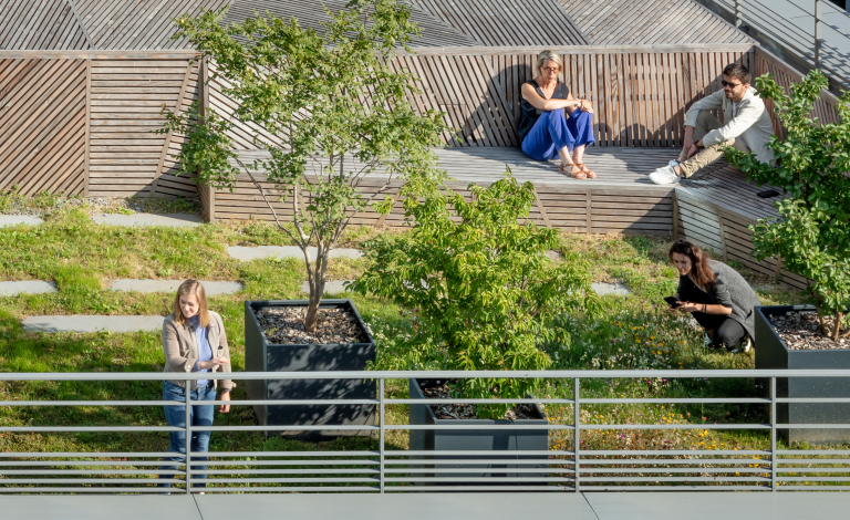La quatrième façade, protégée en gravillons, intègre des panneaux de caillebotis pour masquer les gaines techniques. Les terrasses des patios sont partiellement végétalisées afin d’agrémenter les vues intérieures.