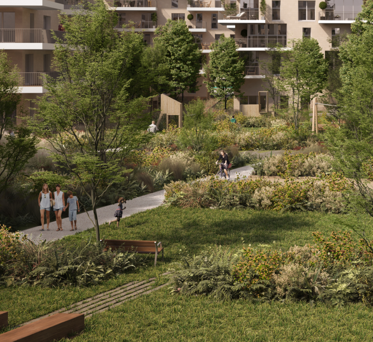 Le projet cherche une transition d’échelle harmonieuse entre le tissu pavillonnaire existant, à préserver selon le PLU, et une nouvelle dimension métropolitaine accompagnant l’arrivée du métro du Grand Paris.