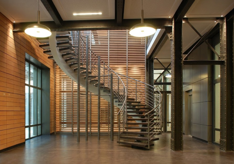 Phase 2 : densification des bureaux et ajout de services (business center, espaces wellness et fitness, locaux vélos). Les espaces modulables prolongent l’écriture contemporaine des halls et offrent confort et flexibilité, avec des escaliers traités comme éléments architecturaux.