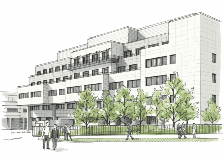 L’organisation spatiale offre une fonctionnalité interne optimale, permettant un déroulement fluide des activités tout en préservant la quiétude du personnel et des patients. L’hôpital cherche ainsi des connexions harmonieuses avec la ville et ses espaces verts pour accompagner le malade.